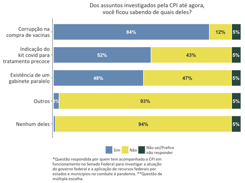 Entre os assuntos investigados pela CPI, a corrupção na compra de vacinas é o mais conhecido pela população que tem acompanhado o trabalho da comissão, sendo citado por 84%, seguido pela indicação do kit covid para tratamento precoce (52%).