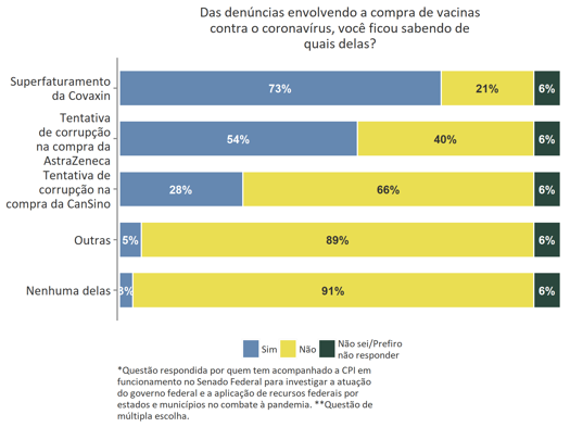 Em relação especificamente às denúncias de irregularidades na compra de vacinas contra o coronavírus, as mais conhecidas pelos brasileiros que acompanham a CPI são o superfaturamento da Covaxin (73%) e a tentativa de corrupção na compra da AstraZeneca (54%).